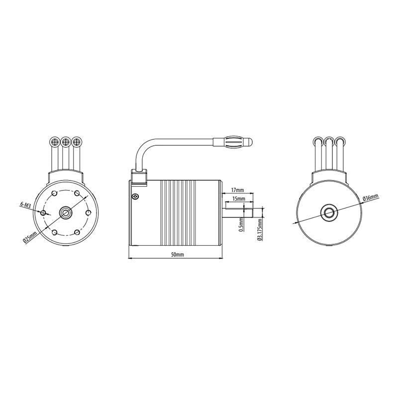| KV (RPM/Volt) | Max Voltage | Max Amps | Rotor Poles | IO | Resistance | Watts | Max RPM | Length (mm) | Diameter (mm) | Weight (g) | Shaft Diameter (mm) | Shaft Length (mm) | Connectors |