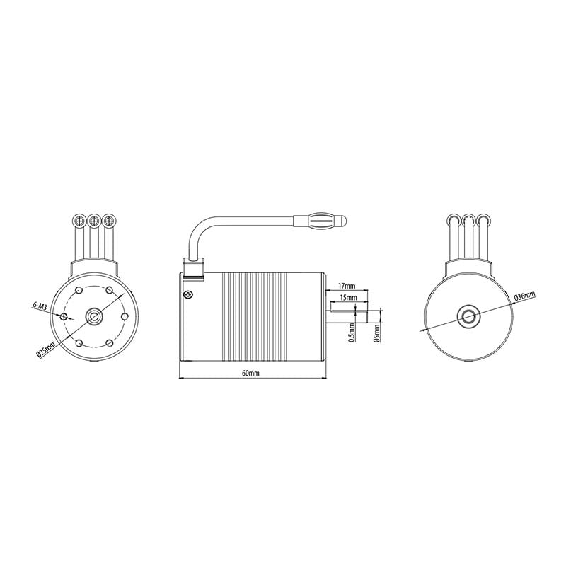 | Turns | KV (RPM/Volt) | Max Voltage | Max Amps | Rotor Poles | IO | Resistance | Watts | Max RPM | Length (mm) | Diameter (mm) | Weight (g) | Shaft Diameter (mm) | Shaft Length (mm) | Connectors |