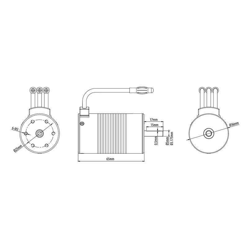 | Turns | KV (RPM/Volt) | Max Voltage | Max Amps | Rotor Poles | IO | Resistance | Watts | Max RPM | Length (mm) | Diameter (mm) | Weight (g) | Shaft Diameter (mm) | Shaft Length (mm) | Connectors |