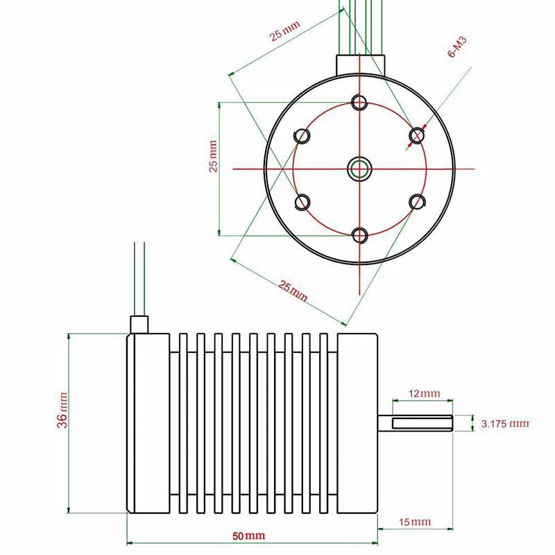 | Turns | KV (RPM/Volt) | Max Voltage | Max Amps | Rotor Poles | Resistance | Watts | Max RPM | Length (mm) | Diameter (mm) | Weight (g) | Shaft Diameter (mm) | Shaft Length (mm) | Connectors |